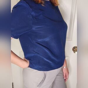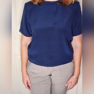 Vtg Diversity LP Navy Blue 100% SILK Crew Neck Shortsleeves Women’s Top Blouse Shoulder Pads