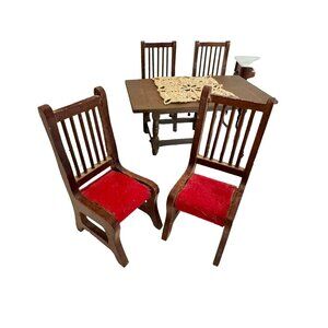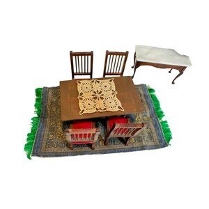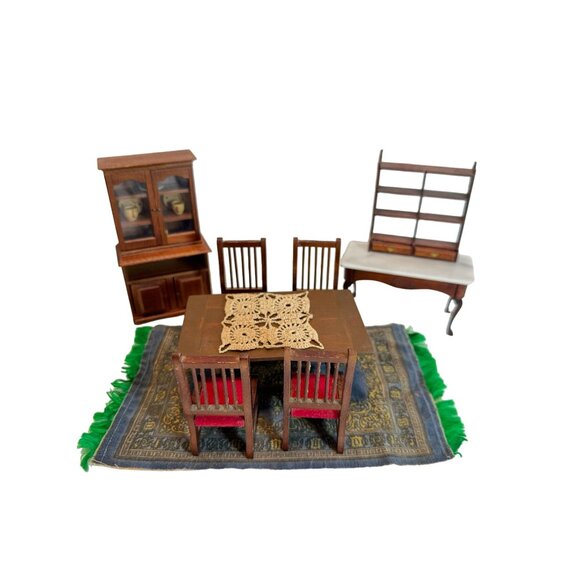 Vtg Dollhouse 1:12 Wood Dining Room Table Chairs China Hutch Shelf Buffet Rug