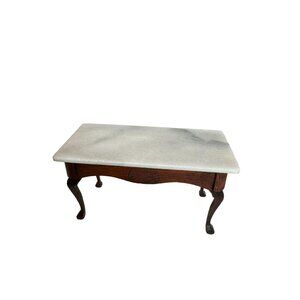 Vtg Dollhouse 1:12 Wood Dining Room Set includes a table, chairs, china hutch, shelf, buffet, and blue rug. Good condition with red velvet chair seats and stone buffet top.