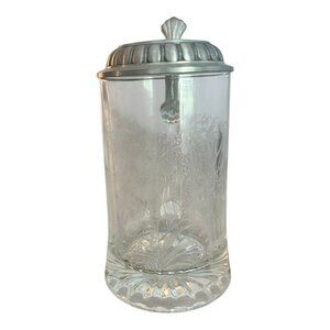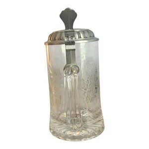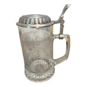 Vtg Domex Glass Beer Stein With 95% Zinn Pewter Lid & Etched Deer Scene Design
