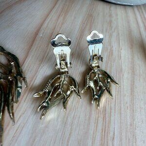 Vtg Doods Brooch & Earring Set Green Iridescent Rhinestones Gold Tone Statement