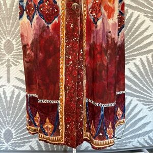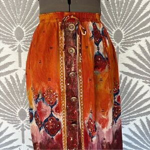 This vintage Dorothy Schoelen Platinum maxi skirt in women’s size Medium is a vibrant and artsy statement piece with strong 80s-inspired style. Made in the USA from soft rayon, it features a bold multicolor paisley pattern, metal button accents, and a full button-front closure. The elastic waistband ensures a comfortable and flattering fit, while the long length adds flow and elegance.