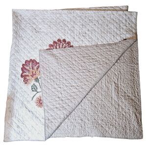 Beautiful Soft Gem! Snuggle up in this vintage reversible curio quilt, featuring timeless orange and pink embroidered flowers with green leavessoft, comfortable, and perfect for adding a boho touch to your bedroom. One side is completely color Mauve and the Main other side is white with flowers printed, also in mauve color, from top to middle bed and from middle bed down it has Embroidered flowers in Pink and orange colors with green leafs. Gorgeous!