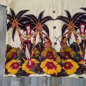 Vintage Dragonfly Clothing Company Island scene, Hawaiian/lounge button-down shirt. It has a vibrant print scene of a ukulele-playing hula dancer, a monkey, and a coconut tree. The shirt is in excellent condition and still has the spare button.