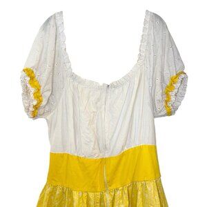 This vintage rockabilly dress features a stylish off-the-shoulder neckline, puff sleeves with ruffle accents, and a flattering knee-length silhouette. The dress is designed with a zip closure and is machine washable for easy care. With a vibrant yellow color and a blend of retro, Western, and punk themes, this handmade piece is perfect for formal occasions or everyday wear. Made in the United States, this unique garment combines elements of Cottage, Prairie, and Swing styles for a standout look that captures the essence of the 50s and 60s fashion eras.