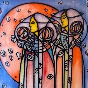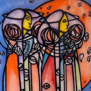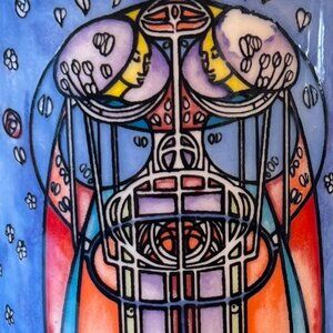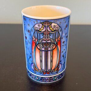 Vintage Dunoon fine white stoneware cup featuring an Art Nouveau-style design with a three panel intricate "stained glass" pattern by artist Joanne Triner, adapted from the work of Scottish architect and designer Charles Rennie Mackintosh (1868-1928) creator of many of the best loved and most influential buildings, furniture and decorative schemes of the early 20th century. The "stained glass" design is features elegant elongated figures and a distinctive linear design that includes the Glasgow Rose, a famous, highly stylized Art Nouveau floral motif, a signature symbol of the Glasgow Style pioneered by Mackintosh and his wife Margaret MacDonald. Measures 4.5” tall with a 2.75” diameter. 4.5’ across including the handle. Holds 10 fluid oz. Crafted in Scotland