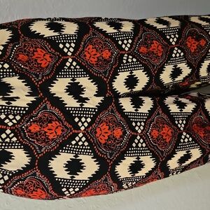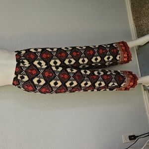 Stylish bohemian wide-leg pants with a vibrant pattern. Features red, black, and cream colors.