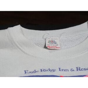 Embrace cozy vintage charm with this authentic 90s Eagle Ridge Inn & Resort sweatshirt! Perfect for lake lovers or anyone seeking unique resort wear, this soft Fruit of the Loom, USA-made crewneck in size Large features a vibrant fall foliage graphic. Please note, as a vintage piece, it shows signs of its journey including fading to the graphics, a softened off-white color, minor pilling, faint small stains, and discoloration around the collar and cuffs – all adding to its character. Review photos carefully for a full understanding of its good vintage condition.