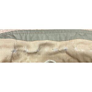 VINTAGE GOOSE DOWN EDDIE BAUER PUFFER JACKET, EXPEDITION OUTFITTER WITH A POLYESTER SHELL AND A CORDUROY COLLAR, SNAP FRONT AND SLASH POCKETS, MADE IN USA IN A LIGHT GREEN KHAKI COLOR, THE SIZE TAG IS WORN, BUT I HAVE CAREFUL MEASUREMENTS BELOW, THE COLLAR HAS SOME WEAR THAT CAN BE SEEN IN PICTURES