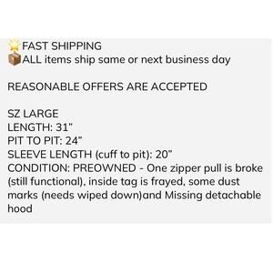 Condition: Preowned - One zipper pull is broke (still functional), inside tag is frayed, some dust marks (needs wiped down)and Missing detachable hood