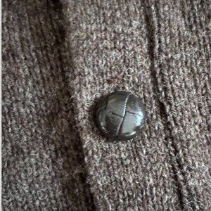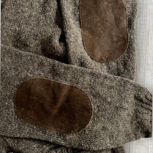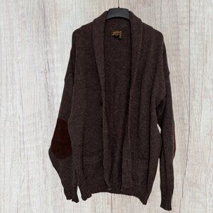 Vintage Eddie Bauer heavyweight wool grandpa cardigan with a classic shawl collar, rich brown heather knit, genuine suede elbow patches, and leather knot buttons.