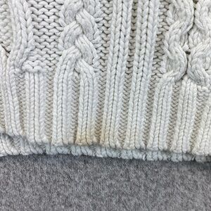 Soft and cozy cable knit sweater. Chunky knit. Exaggerated rolled collar. Two button closure. Neutral cream. Subtle spot noted near trim.