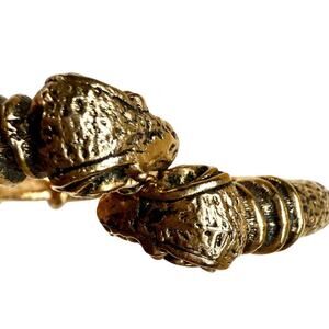Vtg Egyptian Revival Gold Tone Rams Head Bypass Spring Hinge Bangle Bracelet in amazing vintage condition. It looks a lot like KJL Kenneth J. Lane but is not signed.