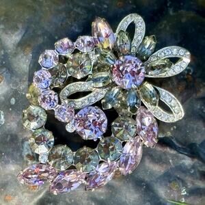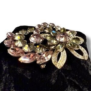This large 3” vintage statement Eisenberg ICE signed Swarovski crystal floral spray brooch is a stunning piece of jewelry with a silver tone finish. The brooch features a flower shape with pink and a pale green marquise and round Swarovski crystals set in silver tone rhodium plated metal. It is accented with a beautiful clear rhinestone ribboned design that adds much texture reminiscent of a traditional bridal bouquet. It is a perfect accessory for various occasions such as engagements, weddings, birthdays, and anniversaries. The intricate design and 3D features make it a unique and eye-catching piece, ideal for those who appreciate upscale luxury, retro, mid century jewelry from the 1930s to 1950s. Made in the United States, this original brooch exudes elegance and sophistication.