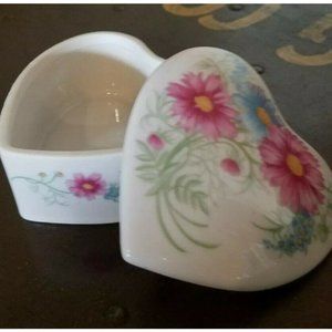 Get this gorgeous, made in Japan, Porcelain Heart Shaped Trinket Box, was made exclusively for Elizabeth Arden, has a floral design with pinks and blues, it is 4" x 4" x 2" Excellent condition, no chips or cracks, see pics for more description.