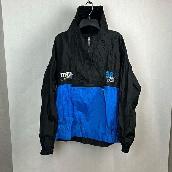 Vtg Elliott Sadler NASCAR Windbreaker Pullover w/Hood Sz XXL m&m's 38 Blue Black
