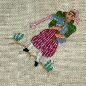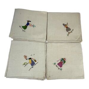 This vintage set of embroidered napkins features three different scenes depicting women in various activities. One shows a lady carting water, another shows a lady playing a guitar, and the third shows a girl playing a flute. The cream-colored linen material adds a touch of elegance to any table setting. The napkins are 9 inches in length and were handmade with great attention to detail. Perfect for collectors or those who appreciate unique and beautiful linens.