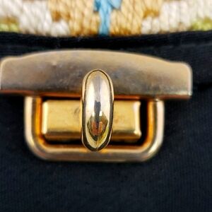 Outside is black fabric and the top is embroidered chevron design in cream, blue, and light green. Gold tone hardware