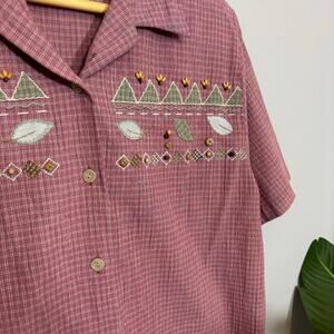 Vtg Embroidered Pink Check Applique Wood Button Cottagecore Top L | Soft Autumn