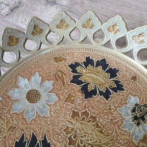 Vtg Enamel & Brass Pedestal Bowl Tray Floral Design Solid Cut 10" Made in India