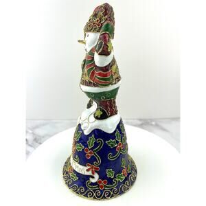 This vintage enamel cloisonne bell features a snowman atop a blue bell with the words "Merry Xmas" in gold.