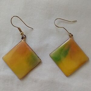 Vtg Enameled Earrings Ombre Diamond Shape Dangle Boho Gypsy Beachy Green Peach.