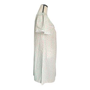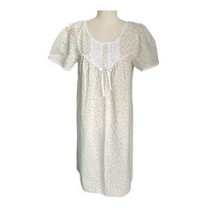 Charming vintage Enchantmates by Miss Elaine nightgown featuring a soft pastel floral print in pink and mint green on white. Adorned with delicate white lace trim, pearly buttons, and a dainty satin bow. Made of lightweight cotton blend fabric with puff sleeves and a flattering empire waistline for a sweet, romantic cottagecore vibe.