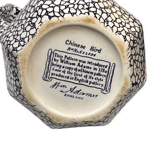 ENGLISH WILLIAM ADAMS DOUBLE SIDED BLUE & WHITE POTTERY PITCHER ORIENTAL DESIGN, BIRDS WITH FLOWERS, MEN 5"L (6" WITH HANDLE) X 5W X 6"H