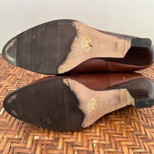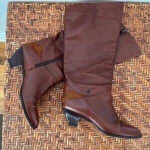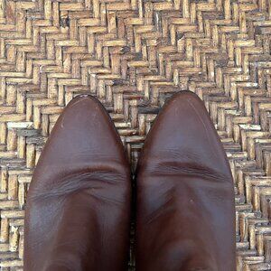 These vintage boots are in very good condition. Their leather is a soft gorgeous brown leather. The heels are in great shape. There are a few scratches on the leather of the boot toes (see photos). They are light and I suspect could be made more subtle or removed with conditioning.