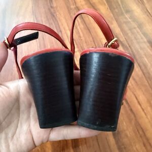 Has signs of wear due to its age super cute on. Please see photos thank you The product is a pair of vintage Etienne Aigner leather slingback heels in size 6.5. These red heels feature a unique square toe design with a buckle closure and a mid-height block heel. The ankle strap provides additional comfort and support, making them suitable for various occasions such as parties, casual outings, workwear, and business meetings. Made in Spain, these designer heels have a classic and timeless style that adds a touch of vintage charm to any outfit.