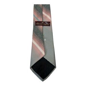 Add timeless sophistication to your wardrobe with this **vintage 1976 Etienne Aigner men's necktie**. Featuring diagonal stripes in slate gray, soft red, and ivory, this classic piece is a stylish nod to mid-'70s fashion. The narrower width and shorter length are consistent with ties from this era, and it’s finished with Aigner's signature horseshoe logo at the tip.
