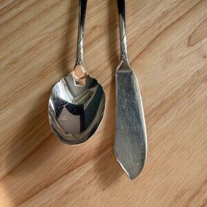 This butter knife and sugar spoon set may not solve your life's problems, but it can certainly spread butter and scoop sugar with style! Made by Oneida in 1950, this silverplated duo is a charming blast from the past.