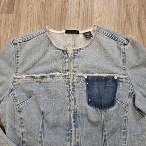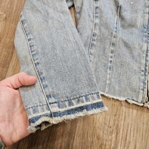 Vtg Express Denim Jacket Womens L Raw Hem Rhinestones 90s Festival Scene Grunge