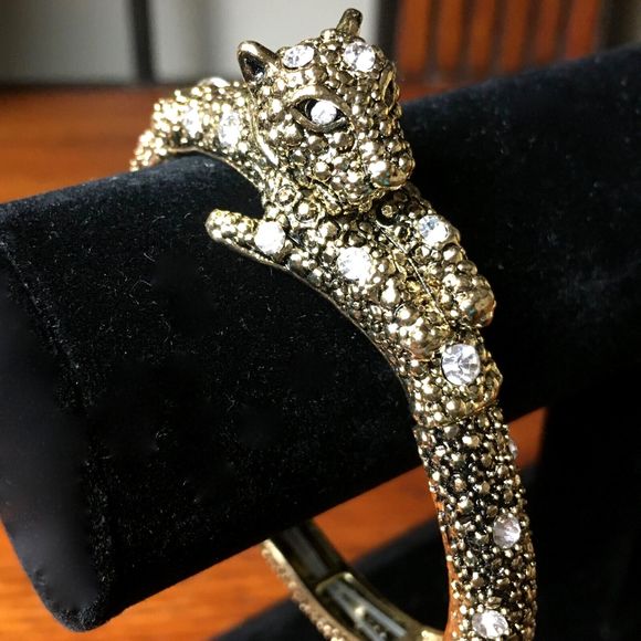 Vtg Exquisite Goldtone Crystal Rhinestone Leopard Hinged Bangle Cuff Bracelet