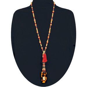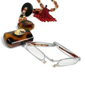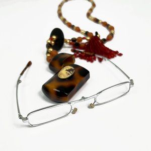 Vintage Eyeglass Case w/ Cameo Pendant on Glass & Wood Beaded Necklace w/ Tassel. Silvertone glasses are inside the faux turtoise case and fold out to make readers. Beads are golden glass, yellow sea glass, and wood plus goldtone bell and button. Tassel attached to necklace with knotted leather cord. Eyeglass strength unknown but could help when you need it. Case shows subtle signs of wear but functions well. This wonderfully unique necklace has been artisan designed and created.