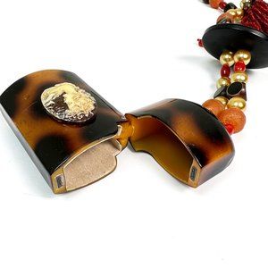 Vtg Eyeglass Case w/ Cameo Pendant on Glass & Wood Beaded Necklace w/ Tassel