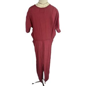 This FLAX by Jeanne Engelhart dress is a stunning addition to any wardrobe. A beautiful earthy red color, it is perfect for any occasion. The dress features pleats, buttons, and pockets, as well as an oversized, collarless design. It has a classic sleeve and a long dress length, making it ideal for winter, summer, fall, or spring.