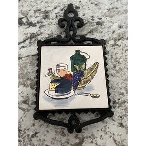Vtg FM Kitchen Décor Cast Iron & Tile Trivet Charcuterie Wine And Cheese Japan