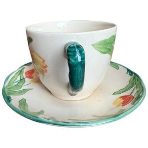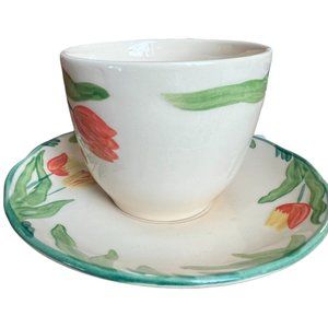 Crafted of earthenware in England and hand-painted, this set is in pristine condition. In fact, the remnants of a tag remains on the bottom of the saucer, suggesting that this set is possibly unused. Franciscan Tulip pieces are retired and collectible; they also look charming paired with Fransicsan Desert Rose pieces (I'm currently selling a Desert Rose gravy boat with an attached plate).