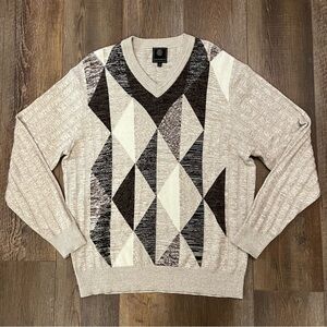 Vintage F/X Fushion Knit Sweater Men's L Argyle / Diamond V-Neck Brown Ivory Black Gray Long Sleeve Y2K