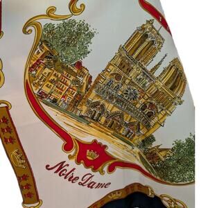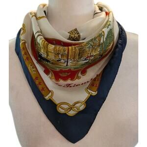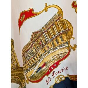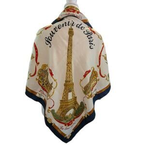This Lahmy vintage fashion souvenir scarf features iconic landmarks from Paris, France such as the Eiffel Tower and the Louvre. Made of polyester in a colorful multi-color design, this tailored scarf exudes a European charm. Crafted in Italy, this stylish accessory adds a touch of elegance and nostalgia to any outfit, making it a perfect addition to any vintage collection or travel memento. Scarf is a large 30" square.