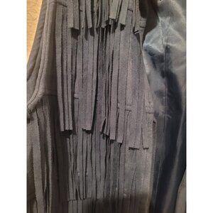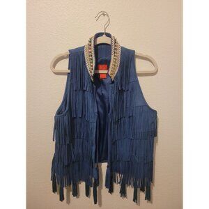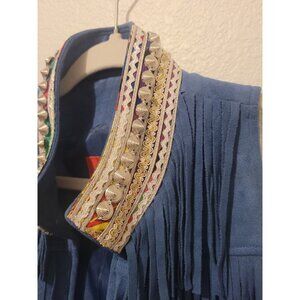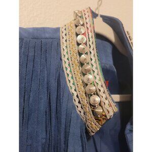 This vintage faux suede fringe tassel studded vest by V Cristina exudes a 70s hippie women's western style. Made from polyester with a mid-length design, the vest features a blue color with acetate lining and microfiber fabric. Perfect for travel, parties, or casual occasions, this regular fit vest with fringe accents embodies the retro and bohemian theme of the era. Ideal for any season, this vest offers a unique and eye-catching addition to any wardrobe.