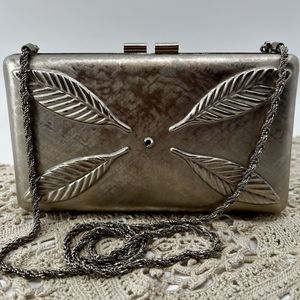 Vtg Feather Leaf Embossed Brushed Silver Metal Kiss Lock Small Chain Purse 7”x4”