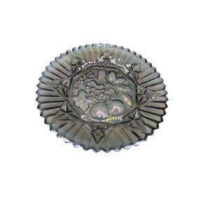 This vintage carnival glass dessert plate features a beautiful iridescent finish and intricate floral design. Its reflective surface adds a touch of elegance to any table setting, while the vintage charm makes it a unique collectible piece.