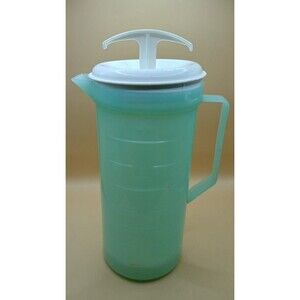 The Vtg Federal Housewares Teal Plastic Sweet Tea Lemonade Mixing Plunger Pitcher is a vintage 2-quart round pitcher made of yellow plastic, featuring a solid pattern. It comes with a pull-off lid, a mixing plunger, and is perfect for serving up to 4 cups of sweet tea or lemonade. This original mixing pitcher from Federal Housewares is a unique piece for collectors or those looking to add a retro touch to their kitchen storage and organization needs. Made in the United States, this pitcher stands at 11 inches tall and has a width of 7 inches.