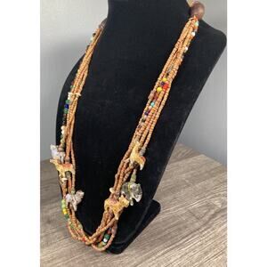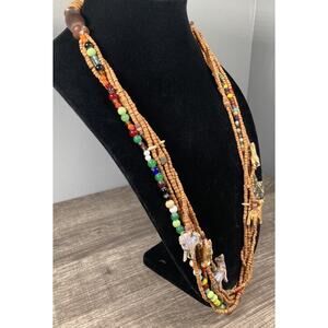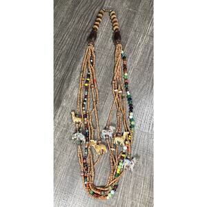 Vtg Fetish Bib Necklace Wooden Ethnic Animals w/ Shell, Glass Beads Hand Carved. This has 6 strands. The upper portion is wooden beads and the lower beads are made of coconut shell I believe. The glass beads are hand made so there are gaps or imperfections mostly to the yellow beads that aren’t sharp. The animals are hand made and have lost some paint with wear over time. This measures 32” in length.. please message me prior to purchase with any questions. Thank you!