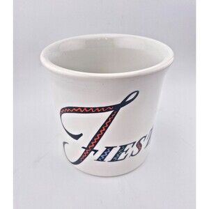 Beautiful Fiesta Coffee Mug is white with multi-colored Fiesta logo spellout with woman in fancy gown graphic.