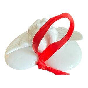 Delight in the charm of this vintage fine bone china cherub angel ornament. Perfect for Christmas decor, it features a red satin ribbon and heart design, adding a touch of elegance to any religious home setting. No Chips or Cracks In Good Condition See Photos Sold as Pictured