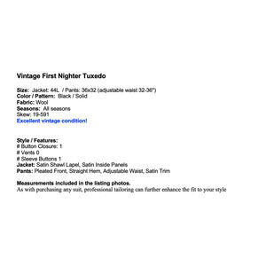 Vtg First Nighter Mens Tuxedo 44L 36x32 Black Tux Suit Adjustable Waist