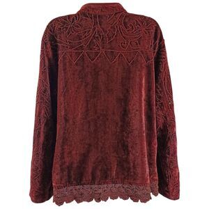 This jacket feels like it walked out of a dream, crushed velvet in a deep wine red, swirling embroidery stitched across every inch, and tiny beads catching the light like embers. The hem finishes in a crochet lace trim, adding texture and depth, a perfect blend of romance and edge.